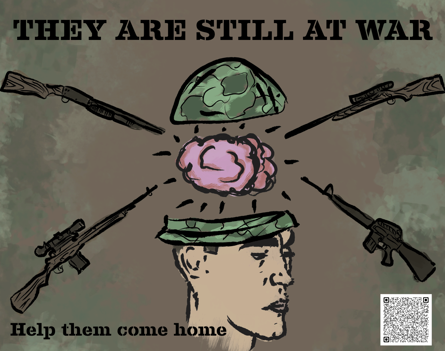 Inspired by my grandfather, this project started as an illustration done in Photoshop for an editorial. Using the same color palette and concept, the idea was expanded to another two designs to make three posters, two portraits, and one type-based. In the original illustration, the guns are US guns used in the Vietnam War, aiming at the soldier’s brain, representing how the damage he had done was hurting him.